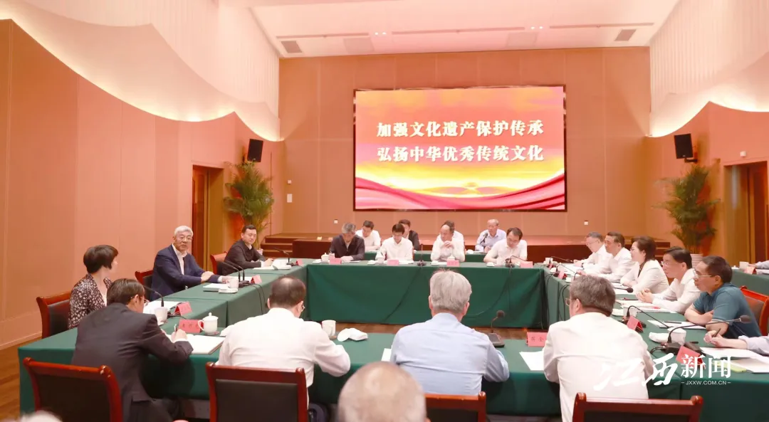 隨后,尹弘主持召開了全省文化遺產保護傳承座談會,聽取有關工作匯報和專家學者發言。尹弘指出,江西是文化大省,歷史悠久,文化燦爛,稻作文化、青銅文化、陶瓷文化、書院文化、紅色文化等璀璨奪目,在中華文明史上占有十分重要的地位。我們要深入學習貫徹習近平文化思想,堅持從“兩個結合”的高度深刻把握新時代新的文化使命,本著對歷史負責、對人民負責的態度,敬畏歷史、敬畏文化,全面保護好歷史文化遺產,精心守護前人留給我們的寶貴財富,推動文化遺產保護傳承工作高質量發展。