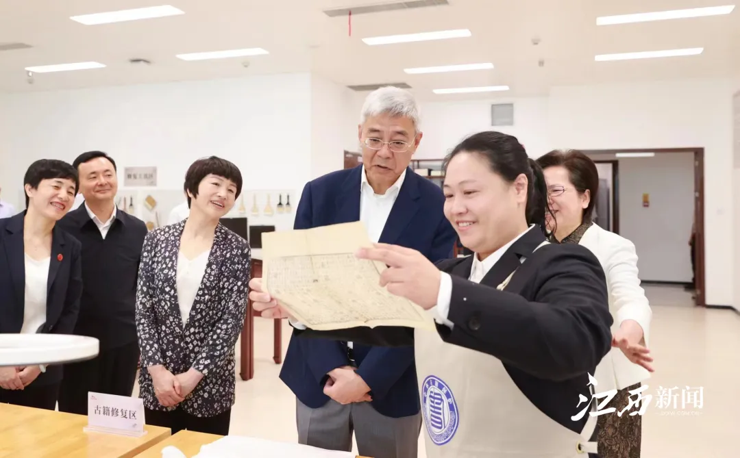 紙壽千年、文脈賡續。在江西省圖書館,尹弘詳細了解古籍保護修復工作,觀摩古籍修復師的匠心絕學,感受延續千年的文脈。尹弘說,古籍是歷史的見證、文化的結晶,是前人留給我們的寶貴財富。我們要加強古籍善本的收集保護,深入推進古籍數字加工,讓文物古籍“活起來”,豐富大眾歷史文化滋養。